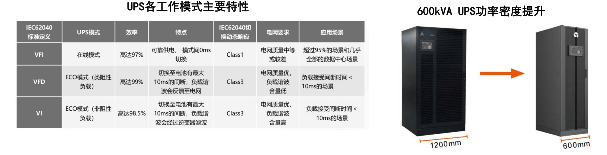 智算中心向MW级,超高效及高密化演进。UPS单机容量由60OkVA提升至1MVA及1.2MVA,减少并机台数,同时可进一步节省系统占地及后期运维成本,成为演进的趋势。同时,UPS需要持续提升功率密度,减小设备占地,以改善供配电设备辅助占比。以600kVAUPS为例,业界常规占地宽度一般为1200mm,但业界已有头部厂商通过架构及器件创新,将宽度缩减至600mm,功率密度提升100%,占地面积下降50%。