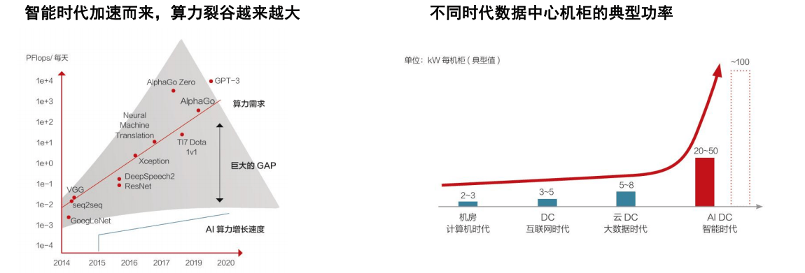 算力增长速度远远慢于算力需求的增长速度,算力裂谷越来越大。根据华为《AIDC白皮书》,预计到2028年,模型参数将达到数百万亿~数千万亿,如此大规模的模型训练需要算力规模和能力的进一步突破AIDC算力密度增长带来功率密度的急剧攀升,给供电、散热及布局等带来极大挑战,正在重塑数据中心能源基础设施。随着数据中心用电量的飙升,尤其是当单个数据中心用电量跃升至200MW乃至500MW以上时,城市现有电力基础设施的瓶颈日益凸显。如OpenAl的“星际之门”项目,预计就会产生高达数千兆瓦的电力需求。