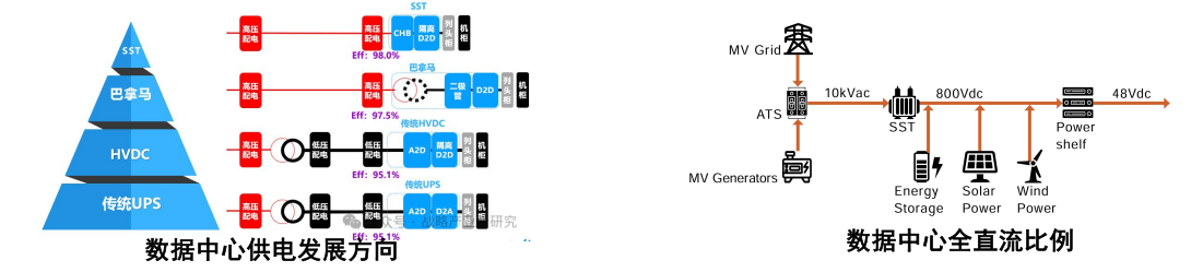 SST方案优势突出。效率高:省去多次AC/DC转换环节,端到端效率突破至98%;面积小:简化了供电链路的多级配电,空间利用率更高;安装快:中压接口、功率转换、控制全部集成一体,预先装好,工厂预制化的生产方式可使现场安装周期缩短75%;维护简单,可融合HVDC方案:模块化插拔设计,维护极其简单,能轻松匹配各种主流数据中心供电架构(2N、N+X、市电+HVDC混合等);AI级响应速度:毫秒级动态响应,GPU负载波动下5ms响应时间,精准匹配AI智算中心的瞬态特性,设置了功率模块冗余、中压故障隔离等多级保护,供电系统安全可靠;集成APF、SVG功能:可实现电能质量的主动治理,完成谐波补偿,可输出感性无功和容性无功,无需额外配置谐波治理模块及无功补偿装置,额定工况下10kV输入侧电流谐波小于1%;可接入绿电:以两端口固态变压器为基础,可以迭代为具备多电压等级交直流端口的“能量路由器”,支持风光储氢接入,助力AIDC用户绿电消纳比例提高至50%+。完美适配新一代智算中心需求。
