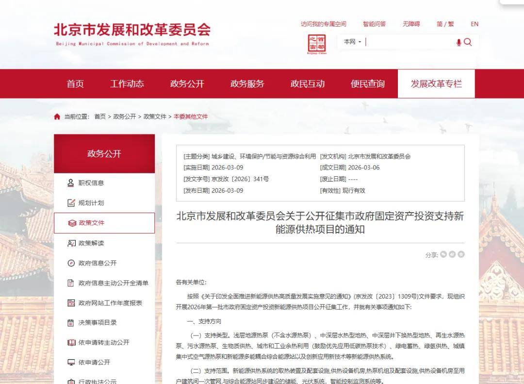 【北京市发改委关于公开征集市政府固定资产投资支持新能源供热项目的通知】近日,北京市发展和改革委员会印发公开征集市政府固定资产投资支持新能源供热项目的通知。