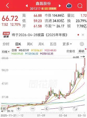 【鑫磊股份A股市值突破100亿元】3月10日午后,鑫磊股份(64.820, 5.62, 9.49%)(301317)一度涨超12%,股价最高触及66.88元/股,创下历史新高,其A股市值也由此突破100亿元。